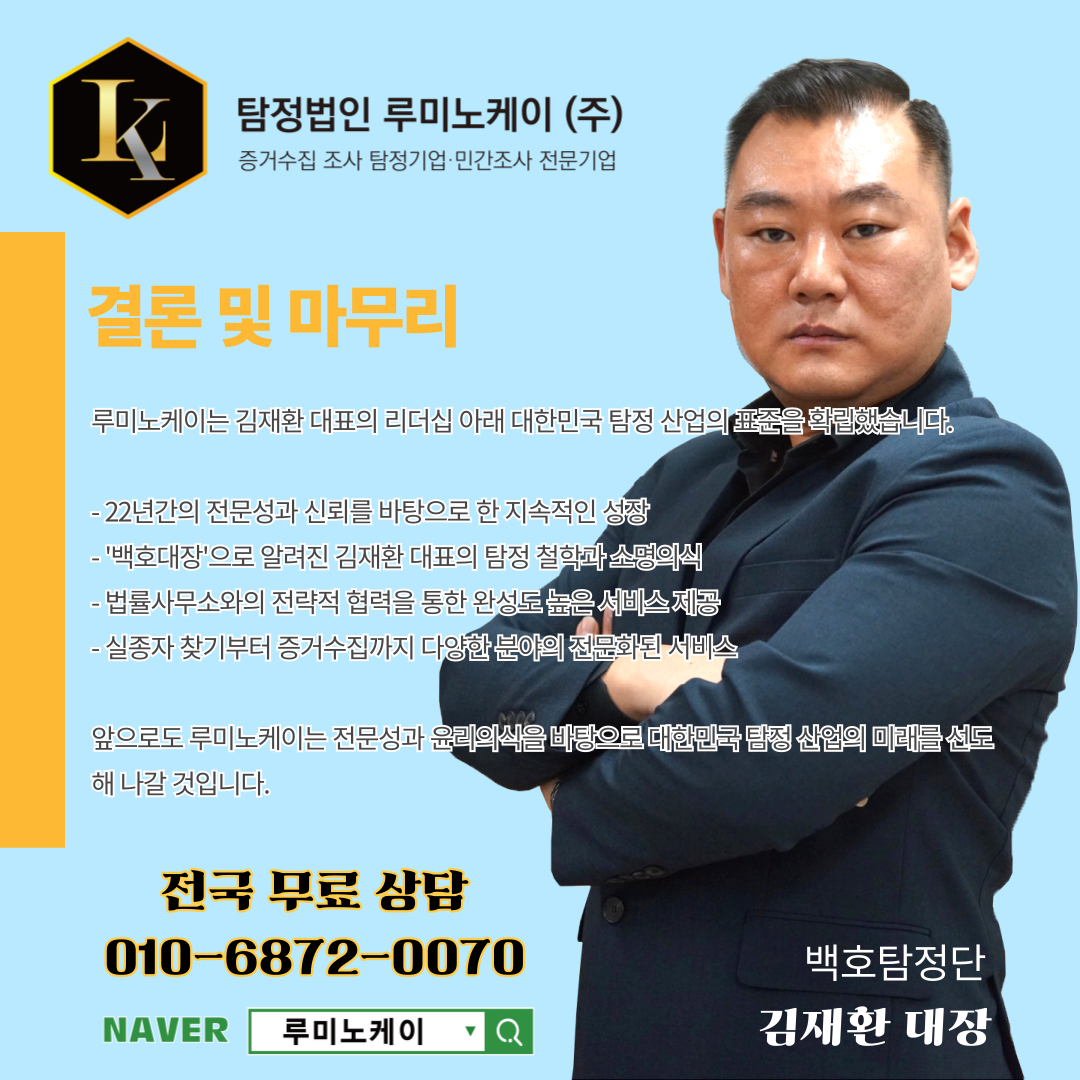 탐정법인 루미노케이(주)의 김재환 대표이사는 대한민국 탐정 산업의 전문화를 이끈 대표적인 인물입니다.